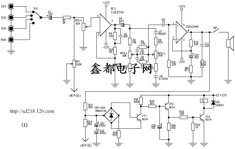 当某种原因某个声道输出端出现直流电压时,如果该直流电压为正,则经R14(或R24)VD1、VT1的B-E结VD4、R31到地,使VT1导通;如果该直流电压为负,则地电平经R31、VD2、VT1的B-E结VD3、R14(或R24)到功放输出端,同样也使VT1导通。VT1导通后,使因VT2基极失去偏置电压而截止,并使VT3截止,继电器K释放,接点K-L、K-R断开,使扬声器与功放输出端脱离,从而保护了扬声器。VD5是保护二极管,防止VT3截止瞬间,继电器线圈产生反向电动势击穿VT3。