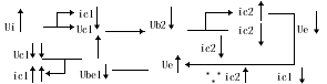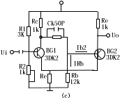 工作原理:设输入ui如图一(b)示,当ui=0时,电路处于BG1截止,BG2导通的稳定状态。这时输出电压为:uo=u2=Ec-(ue2/Re)Rc2