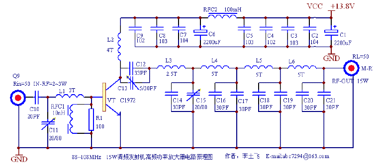该功率放大器可将功1—2W、88—108MHZ调频发射机的功率扩展至于10—15W,采用单管丙类放大及多级低通滤波器组成,具有较高的转换效率及很强的诣波抑制能力。