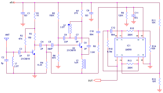 接收机可使用超再生电路或超外差电路,超再生电路成本低,功耗小可达100uA左右,调整良好的超再生电路灵敏度和一级高放、一级振荡、一级混频以及两级中放的超外差接收机差不多。然而,超再生电路的工作稳定性比较差,选择性差,从而降低了抗干扰能力。下图为典型的超再生接收电路。