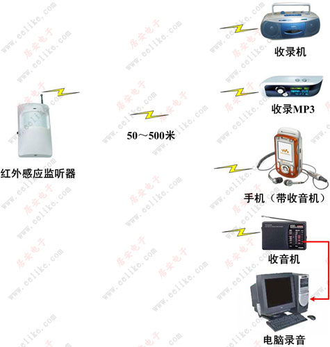 3、打开调频收音机,或者带有收音功能的手机、MP3,将接收频率调到标签所标的频率值上即可听到清晰的高保真立体声音乐了。 1、作为防盗系统使用,一旦有区域内有声响,立即启动监听和FM调频发射电路,同时远端的自动接收机(或FM收音机)开启,立刻监听现场的细微动静。 2、当环境声响波动时,才启动监听和FM调频发射电路,平时发射电路不工作,耗电极微,电池可以使用很长时间。 3、发射距离远。采用9V高电压供电,直线发射距离可达300米。 4、外观精美,背面可用双面胶纸粘贴在桌子底下下或者窗边、墙上,安装简单快捷。 5、可自由定制和调校发射频率。如果不想让普通收音机收到信号,可以调校频率避开普通FM广播频段(88Mhz~108Mhz),然后使用特殊接收机接收。 ![]() ![]() ![]() 工作电压:9V 主要应用: