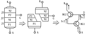 不管可控硅的外形如何,它们的管芯都是由P型硅和N型硅组成的四层P1N1P2N2结构。见图1。它有三个PN结(J1、J2、J3),从J1结构的P1层引出阳极A,从N2层引出阴级K,从P2层引出控制极G,所以它是一种四层三端的半导体器件