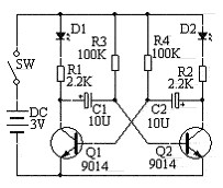 C:本电路是一个典型的多谐振荡电路。由Q1、Q2交叉耦合而成。R1、R2分别是Q1、Q2的集电极电阻。R3、R4分别是Q1、Q2的基极偏置电阻。多谐振荡器没有稳定状态,要么Q1截止、Q2导通;要么Q1导通,Q2截止,这两状态周期性的自动翻转,D1、D2周而复始的交替点亮。